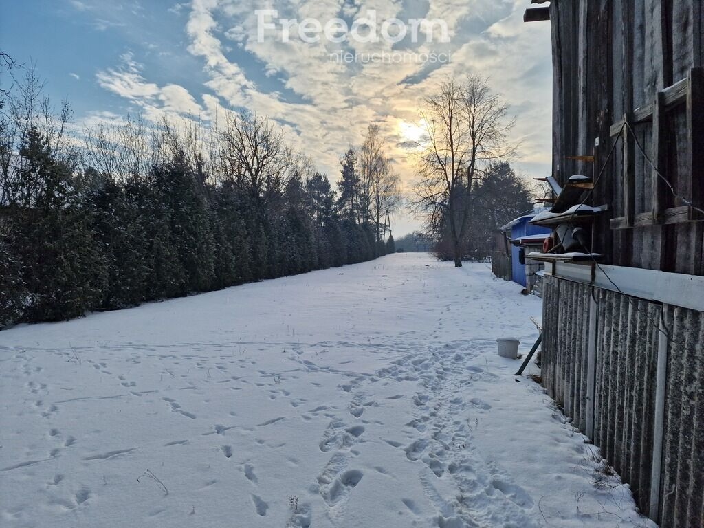 Na działce znajduje się drewniany dom, drewniana stodoła oraz